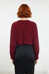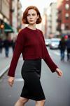 Ürün Özellikleri: Oversize kalıp, akrilik materyal, düz desen, bisiklet yaka, uzun kol, triko kumaş, bordo renk, baskısız tasarım, crop boy.