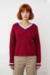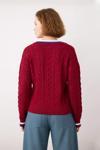 Ürün Özellikleri: Regular kalıp, %100 akrilik materyal, saç örgü desen, V yaka, düşük kol, triko kumaş, bordo renk, baskısız tasarım.
