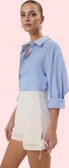 Yüksek kaliteli %53 pamuk ve %47 polyester karışımı kumaştan üretilen bu şort, hem dayanıklı hem de uzun ömürlüdür. Straight silueti her vücut tipine uyum sağlayacak şekilde tasarlanmıştır. Brode dokuması, şorta şık ve dikkat çekici bir görünüm kazandırırken, aynı zamanda nefes alabilir bir yapı sunar. Kısa boyu sayesinde sıcak havalarda serin ve rahat kalırsınız. Yüksek bel tasarımı, vücut proporsiyonlarınızı dengeleyerek daha uzun ve ince bir görünüm sağlar. Geniş paça ise özgür hareket kabiliyeti sunar. Beyaz rengi, her türlü üst giyim ile kolayca kombinlenebilir, size çok yönlü bir tarz sunar.