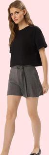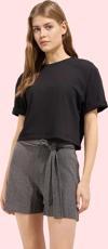 Bu şık ve rahat kısa şort, yaz aylarının sıcak günlerinde tarzınızdan ödün vermeden serin kalmanızı sağlar. Gri rengi ve düz deseniyle her kombininize uyum sağlar. Bürümcük dokuma detayı ve bağlama detaylı tasarımıyla tarzınıza farklı bir hava katarken, rahat kesim ve beli lastikli yapısıyla gün boyu konfor sunar. Nefes alan ve yumuşak örme kumaştan üretilen şort, %73 pamuk, %22 polyester ve %5 elastan karışımı ile dayanıklı ve kolay temizlenebilir bir yapıdadır. Makinede yıkanabilir olması da pratik kullanım sunar.