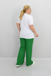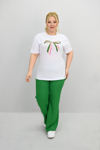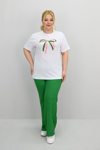 Kadın büyük beden ikili eşofman takımı, 36-50 bedene uyumludur. Üst kısmı kısa kollu ve bisiklet yaka modeldir. Göğüs kısmında kurdele desenli pul payet ve nakış işlemeleriyle dikkat çeker. Alt kısmı ise keten görünümlü dokuma kumaştan üretilmiş, yüksek bel ve lastikli yapısıyla rahat bir kullanım sunar. Cepli ve düz paça formundaki alt parça günlük kombinleriniz için idealdir. Manken ’in üzerindeki beden 44 bedendir. (Bedenler arası +/- 2cm fark olmaktadır.) Model Ölçüleri Boy: 1,72 Kilo: 90 Göğüs: 104 Bel: 88 Basen: 115 Kumaş İçeriği : %100 Pamuk Üst Boy : 74 cm’dir. Göğüs : 112 cm’dir. Bel : 80 cm’dir. Alt Boy : 108 cm’dir. Basen : 116 cm’dir.