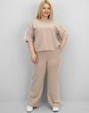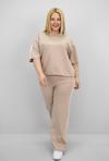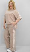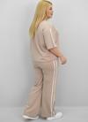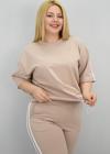 Günlük giyimde hem konforu hem de modern görünümü bir arada sunan bu kadın büyük beden eşofman takımı, 42-50 bedene uyumludur. Bisiklet yaka ve kısa kollu tasarıma sahip üst parçası, kollarında ve alt yan kısımlarında yer alan şerit detaylarıyla dinamik bir görünüm kazandırıyor. Üst kısmın etek ucunda yer alan ayarlanabilir büzgü detayı, vücuda göre şekil alarak kullanıcısına esneklik sunuyor. Alt parça ise yüksek bel, lastikli ve cepli yapısıyla hem rahat hem işlevsel. Bol paça kesimi sayesinde gün boyu özgürce hareket edebilir, sportif ve modern bir görünüm elde edebilirsiniz. Yumuşak ve nefes alabilir 2 iplik kumaştır. Manken ’in üzerindeki beden 44 bedendir. (Bedenler arası +/- 2cm fark olmaktadır.) Model Ölçüleri Boy: 1,72 Kilo: 90 Göğüs: 104 Bel: 88 Basen: 115 Kumaş İçeriği : %80 Pamuk %15 Polyester %5 Elastan Üst Boy : 61 cm’dir. Göğüs : 128 cm’dir. Kol Boyu : 27 cm’dir. Bel : 74 cm’dir. Basen : 140 cm’dir. Alt Boy : 106 cm’dir.