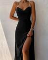 Kadın Buzi Kumaş Yırtmaç Detaylı Zincir Aksesuarlı Taşlı Elbise