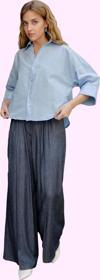 Hem şık hem de rahat olmak isteyen kadınlar için mükemmel bir seçim olan bu lacivert geniş paça pantolon, yaz aylarının sıcak günlerinde bile konforlu bir kullanım sunuyor. Yüksek bel tasarımı ve geniş paçası ile vücut hatlarınızı kusursuz bir şekilde vurgularken, özgürce hareket etmenizi sağlıyor. 100% polyesterden üretilen Chambre dokuma kumaş, nefes alabilir özelliği ve dayanıklı yapısı ile öne çıkıyor. Kırçıllı deseni, pantolona modern ve şık bir hava katıyor. Günlük kombinleriniz için ideal olan bu pantolon, farklı üstlerle kolayca kombinlenebiliyor. İster şık bir bluzla, ister basic bir tişört ile tamamlayabilirsiniz. Çalışma ortamında, arkadaşlarınızla buluşmalarda veya hafta sonu gezilerinizde rahatlıkla kullanabileceğiniz bu pantolon, gardırobunuzun vazgeçilmez parçalarından biri olacak. Kolay yıkama ve bakım özelliği ile pratik kullanım sağlıyor. Regular boyuyla çoğu vücut tipine uygun olan pantolon, benzersiz tarzınızı yansıtırken konforunuzu da ön planda tutuyor. Yaz aylarının enerjisini taşıyan bu pantolon ile stilinizi tamamlayın.