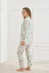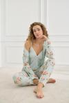 Takım; ince ip askılı bluz, uzun paçalı pijama altı ve aynı desene sahip sabahlıktan oluşur.