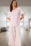 Yumuşak, nefes alan %100 pamuklu kumaşıyla gün boyu rahatlık sunan bu şık pijama takımı, evde huzurlu ve konforlu vakit geçirmenizi sağlayacak. Mor rengi ve zarif çiçek deseniyle yatak odanızın havasını değiştirecek. Bisiklet yakası ve kısa kollarıyla yaz aylarında serinlemenizi sağlar. Regular kalıbıyla vücudunuzu sararak mükemmel bir uyum sunar. Normal bel özelliğiyle gün boyu rahatlık sağlar. Pantolonun boru paçası şıklığıyla tamamlanır. İlkbahar ve sonbahar aylarında ideal olan bu pijama takımı, 2'li paket içeriğiyle hem ekonomik hem de pratik bir seçenektir. Makinede yıkanabilir özelliği ise temizliğini kolaylaştırır.