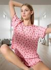 Tatlı rüyaların ve konforlu gecelerin adresi! Pembe çiçekli fırfırlı örme pijama takımımız, yaz gecelerinin vazgeçilmezi olacak. Hafif ve nefes alan 100% polyester kumaşından üretilen bu takım, yumuşak dokusuyla teninizde ipeksi bir his bırakacak. Düşük kol ve kayık yaka detayıyla şıklığı yakalarken, fırfırlı detaylarıyla feminen bir tarz oluşturuyor. Regular kalıbıyla rahat bir uyum sunan takım, boru paça şortu ve kısa kollu üstü ile mükemmel bir denge sağlıyor. Metraj baskı tekniği ile elde edilen çiçekli desen, her detayda özenin hissedildiği bir görünüm sunuyor. Evde rahatlamak veya uyumak için ideal olan bu takım, yaz aylarında serin ve konforlu kalmanıza yardımcı olacak. Makinede 60 derecede yıkanabilir özelliğiyle de pratik kullanım sağlıyor.