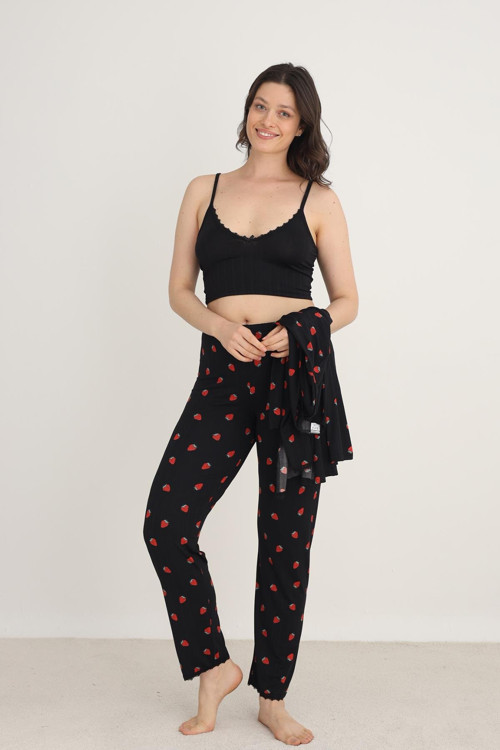 Kadın Çilek Desenli İp Askılı Sabahlıklı 3’lü Pijama Takımı, hem zarif görünümü hem de sunduğu konforla ev giyiminizi bir üst seviyeye taşıyor.