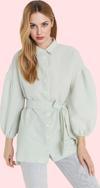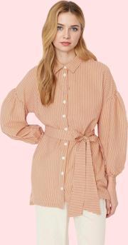Yaz aylarının sıcak günlerinde serin ve şık kalmanın sırrı, işte burada! Mor ve beyaz çizgilerin zarif dansıyla göz alıcı bir görünüme kavuşun. Rahatlığı ve şıklığı birleştiren bu uzun kollu gömlek, benzersiz dokusuyla gün boyu konfor sunar. Balon kolları ve A-line silüetiyle feminen bir hava katarken, belinizi saran kuşağıyla da kusursuz bir vücut hatları oluşturmanıza yardımcı olur.