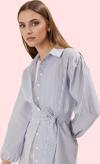 Yaz aylarının sıcak günlerinde serin ve şık kalmanın sırrı, işte burada! Mor ve beyaz çizgilerin zarif dansıyla göz alıcı bir görünüme kavuşun. Rahatlığı ve şıklığı birleştiren bu uzun kollu gömlek, benzersiz dokusuyla gün boyu konfor sunar. Balon kolları ve A-line silüetiyle feminen bir hava katarken, belinizi saran kuşağıyla da kusursuz bir vücut hatları oluşturmanıza yardımcı olur.