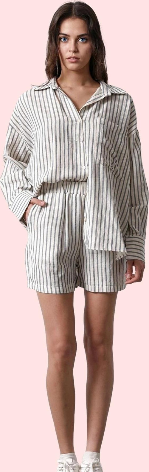 Rahatlığı ve şıklığı bir araya getiren bu bej çizgili müslin şort ile yaz aylarının tadını çıkarın! Yüksek bel tasarımı ve geniş paçası sayesinde hem rahat bir kullanım sunar hem de silüetinize zarif bir dokunuş katar. %100 pamuk müslin kumaşının yumuşak dokusu ve nefes alabilir yapısı ile gün boyu konforlu hissedeceksiniz. Kısa boyu ve modern çizgileri ile günlük kombinlerinizin tamamlayıcısı olacak bu şort, sıcak yaz günlerinde serin ve şık kalmanızı sağlar. Makinede kolayca yıkanabilen bu şort, uzun süreli kullanım için dayanıklı ve kaliteli bir yapıya sahiptir. Düzgün ve şık bir görünüm için, şortun yüksek bel detaylarıyla vücut hatlarınızı dengeleyerek kusursuz bir uyum yakalayacaksınız. Bu şort ile ister plajda yürüyüş yapın, ister arkadaşlarınızla buluşmaya gidin, her zaman şık ve rahat hissedeceksiniz.