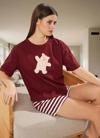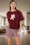 Bu şirin ve rahat bordo pijama takımıyla kendinizi evinizin konforuna bırakın. Yumuşak pamuklu kumaşı ve sevimli ayıcık baskısıyla, uykuya dalmak için ideal bir seçim. Kısa kollu tişörtü ve çizgili şortu ile yaz aylarında serin ve rahat hissetmenizi sağlar. Nefes alan yapısıyla gece boyunca konforlu bir uyku deneyimi sunar. %100 pamuk malzemesi, hassas cildiniz için mükemmel bir seçenektir. Regular kalıbıyla vücuda tam oturur ve hareket özgürlüğü sağlar. Makinede kolayca yıkanabilir ve düşük ütü gerektirebilir. Bu pijama takımıyla, evde vakit geçirirken veya dinlenirken şıklıktan ödün vermeden rahatlayabilirsiniz.