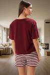 Bu iki parçalı pijama takımı, bir tişört ve bir şorttan oluşur. Bordo rengi ve beyaz çizgilerle modern ve şık bir görünüm sunar. Her yaşa ve stile uygun, evde rahatlık arayan kadınlar için mükemmel bir tercih. İster arkadaşlarınızla bir gece vakti sohbet ederken ister film gecesi düzenlerken, bu pijama takımıyla tarzınızdan ödün vermeden rahatlayabilirsiniz. Rahatlığı ve şıklığı bir arada sunan bu pijama takımını hemen sepetinize ekleyin!