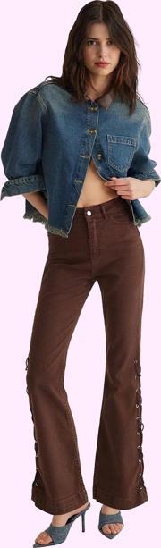 Kumaş: Pamuklu, Boy: Uzun, Bel: Yüksek Bel, Renk: Kahverengi, Paça Tipi: İspanyol Paça, Siluet: Flare, Kalıp: Flare, Desen: Düz, Ek Özellik: Esnek, Kapama Şekli: Fermuarlı, Dokuma Tipi: Comfort, Materyal Bileşeni: 98% Pamuk, 2% Elastan, Yıkama Talimatı: T18, Menşei: TR, Koleksiyon: Denim, Ortam: Casual/Günlük, Kemer/Kuşak Durumu: Kemersiz, Sürdürülebilirlik Detayı: Hayır, Persona: Fashion Forward