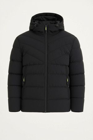 Siyah Nano Kumaş Su Ve Rüzgar Geçirmez Kapüşonlu Kalın Şişme Kaban&Mont