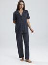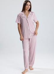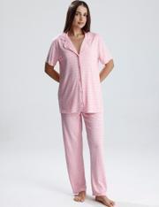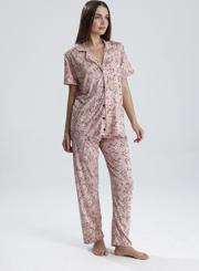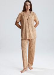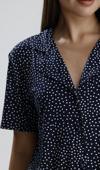 Klasik ve zarif görünümüyle öne çıkan lacivert zemin üzeri beyaz puantiye desenli bu kadın pijama takımı, rahatlık ve stil arayanların favorisi olacak. Hafif ve yumuşak kumaşı sayesinde gece boyu konfor sunarken, önden düğmeli kısa kollu üst ve düz paça alt tasarımı ile modern bir ev giyim deneyimi yaşatır. Şıklığı rahatlıkla buluşturan bir tasarım arayanlar için ideal.