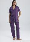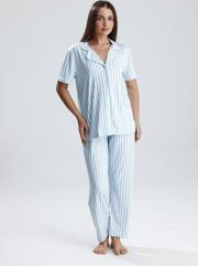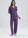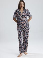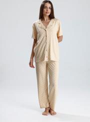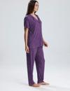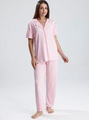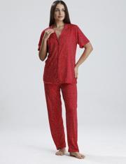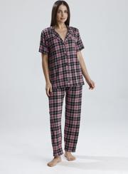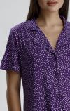 Canlı mor tonu ve zarif puantiye detaylarıyla dikkat çeken bu kadın pijama takımı, evde stilinden ödün vermek istemeyenler için tasarlandı. Önden düğmeli kısa kollu üst, klasik yakasıyla zarif bir görünüm sunarken, düz paça altı maksimum rahatlık sağlar. Hafif ve nefes alan kumaşı sayesinde her mevsim konforlu kullanım sunar.
