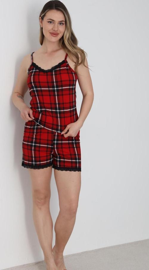 Ekose desenli dantel detaylı ip askılı şort takım, dikkat çekici kırmızı-siyah ekose deseni ve zarif dantel dokunuşlarıyla stilinizi yansıtır.