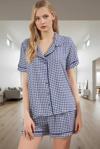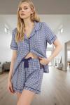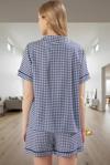 Yüksek kaliteli %100 viskoz kumaşından üretilen pijama takımımız, yumuşak dokusu ve nefes alabilir özelliği ile cildinize mükemmel bir uyum sağlar. Gömlek yakası ve kısa kolları ile sıcak yaz gecelerinde serin kalmanıza yardımcı olur. Boru paça şortu ve rahat kalıbıyla hareket özgürlüğü sunar. Ekose desen ve lacivert renk seçimi ile her zaman şık hissetmenizi sağlar. Kurdele fiyonk detayı ile pijama takımınıza romantik bir hava katılmıştır.