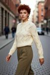 Kadınlar için tasarlanan bu ekru ajurlu dik yaka triko kazak, regular kalıbı ile gün boyu konfor ve şıklığı bir araya getiriyor. Yumuşacık akrilik materyali sayesinde cildinize hoş bir dokunuş sunarken, ajurlu deseni ürüne modern ve havalı bir hava katıyor. Canlı ekru rengi, gardırobunuzdaki diğer parçalarla kolayca uyum sağlayarak çeşitli kombinler yapmanıza olanak tanır. Süper crop boyu ile genç ve dinamik bir görünüm sunarken, kalın triko kumaşı serin akşamlarda ideal bir sıcaklık sağlar.