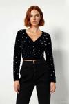 Ürün Özellikleri: Fitted kalıp, %100 polyester materyal, nakışlı/işlemeli desen, V yaka, standart kol, triko kumaş, siyah renk, super crop boy.