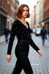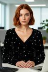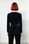 Ersefa Kadın Fitted Basic V Yaka Siyah Tüylü İnci Detaylı Super Crop Uzun Kollu Triko Kazak İddialı Stil