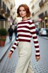 Ürün Özellikleri: Fitted kalıp, akrilik materyal, çizgili desen, bisiklet yaka, standart kol, triko kumaş, bordo renk.