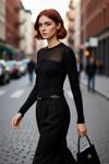 Bu zarif kadın triko kazak, fitted kalıbı ile vücuda kusursuz bir şekilde oturarak modern ve şık bir siluet sunar. Yüksek kaliteli viskoz ağırlıklı özel iplik karışımı sayesinde teninize yumuşak bir dokunuş sağlarken, merserize görünümlü yapısıyla lüks bir his uyandırır. Transparan ve ajurlu detaylar, tasarıma sofistike bir dokunuş katarken, siyah rengi ile her kombine kolayca uyum sağlar. Gündüzden geceye uzanan şıklık arayan kadınlar için ideal bir parçadır.