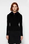 Ürün Özellikleri: Fitted kalıp, akrilik materyal, düz desen, kürklü yaka, standart kol, triko kumaş, siyah renk.