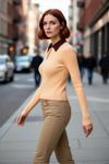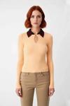 Kadınlar için tasarlanan bu fitted polo yaka triko body kazak, ince yapısıyla bahar ve sonbahar mevsimlerinde gardırobunuzun yıldızı olmaya aday. %50 viskoz, %28 polyester ve %22 poliamid özel iplik materyal bileşimi, üstün yumuşaklık ve esneklik sağlayarak gün boyu rahatlık sunar. Renk bloklu koyu polo yakasıyla modern bir stil yakalayan bu kazak, göğüs kısmındaki inci detaylı anahtar deliği kesimiyle zarif ve çekici bir görünüm sergiler. Açık şeftali tonları, enerjik ve stil sahibi bir duruş vaat ederken, cool ve comfort personasını mükemmel yansıtır.
