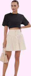 Kumaş Tipi:Dokuma, Renk:Bej, Bel:Yüksek Bel, Boy:Kısa / Mini, Siluet:Kloş, Dokuma Tipi:Gabardin, Materyal Bileşeni:97% Pamuk, 3% Elastan, Yıkama Talimatı:T10, Sezon:Tüm Sezonlar, Menşei:TR, Desen:Düz, Ortam:Casual/Günlük