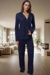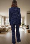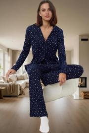 Yumuşak ve rahat bir uyku için tasarlanan bu lacivert kadın pijama takımı, yıldızlarla süslü galaksi deseniyle göz alıcı bir şıklığa sahip. %100 pamuklu yapısıyla cildinizde ipeksi bir his bırakırken, nefes alabilir özelliğiyle de gece boyunca konforunuzu sağlar. Gömlek yakalı üst ve geniş paçalı pantolon; Regular kalıbıyla vücudunuza mükemmel uyum sağlar. Uzun kollu tasarımı sayesinde kış aylarında da sizi sıcak tutar. Metraj baskı tekniği ile canlı renkler ve net desen garanti edilir. Makinede kolayca yıkanabilir olan bu pijama takımı, uzun süreli kullanım için dayanıklıdır. Kendinizi evinizin konforunda şımartın ve bu rahat pijama takımının keyfini çıkarın.
