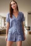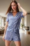 Yumuşak viskondan üretilen bu mavi galaksi desenli pijama takımıyla, evinizde rahatlığın ve şıklığın tadını çıkarın. Kısa kollu gömlek ve şorttan oluşan takım, yaz aylarında serin ve konforlu bir uyku deneyimi sunar. Nefes alabilen viskon kumaş, gün boyu ferahlık hissi verirken, şık galaksi deseni ev giyim stilinize modern bir dokunuş katacaktır. Düğmeli gömlek tasarımı kolayca giyip çıkarılmasını sağlar. Normal bel şort, rahat bir oturuş sunar. Bu pijama takımı, hem evde dinlenirken hem de uyurken konforlu ve şık görünmenizi sağlayacak. Rahat kesim ve yumuşak dokusuyla, kendinizi özel hissetmenizi sağlayacak. Serin yaz akşamlarında ideal bir seçimdir.
