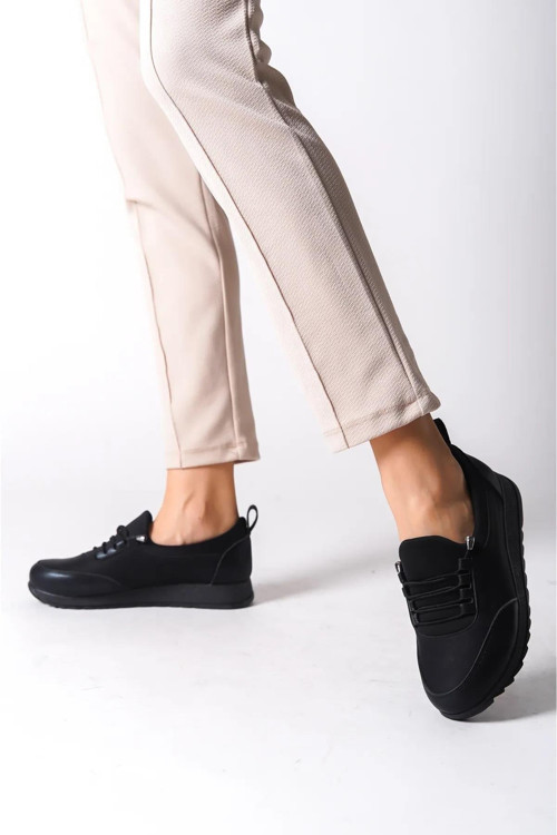 Kadın Galina Bağcıklı Lastikli Ortopedik Rahat Taban Taş Detaylı Günlük Babet Anne Ayakkabısı Siyah