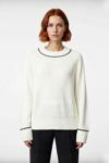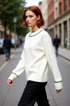Ürün Özellikleri: Oversize kalıp, akrilik materyal, renk bloklu desen, bisiklet yaka, standart kol, triko kumaş, ekru renk.