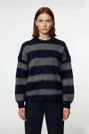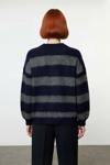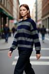Ürün Özellikleri: Oversize kalıp, akrilik polyester materyal, çizgili desen, bisiklet yaka, düşük kol, triko kumaş, lacivert gri renk.