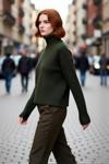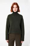 Ürün Özellikleri: Oversize kalıp, akrilik polyester yün materyal, düz desen, dik yaka, standart kol, triko kumaş, haki renk.