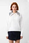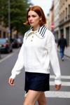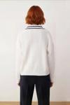 Ürün Özellikleri: Oversize kalıp, %100 akrilik materyal, saç örgülü ve renk bloklu desen, devrik yaka, düşük kol, triko kumaş, ekru renk, Selanik dokuma.