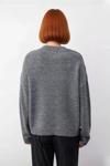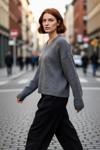 Ürün Özellikleri: Geniş kalıp, akrilik materyal karışımı, düz desen, V yaka, standart kol, triko kumaş, gri renk, baskısız tasarım.