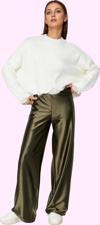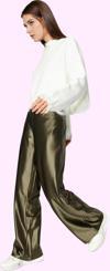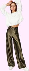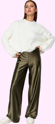 Yüksek kaliteli saten kumaşın zarif parlaklığı ve yumuşak dokusu, pantolonunuza lüks bir hava katarken, örme yapısı gün boyu konfor sağlar. Geniş paça tasarımı hem modern hem de zamansız bir stil sunar. Yüksek bel kesimi, vücut hatlarınızı en güzel şekilde vurgular ve silüetinize ince bir görünüm kazandırır. Pantolonun düz deseni sayesinde her türlü üst giyim ile kolayca kombinleyebilirsiniz. Casual tarzınızı tamamlarken şıklığınızdan ödün vermenize gerek yok.