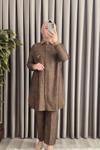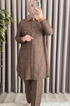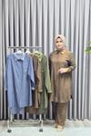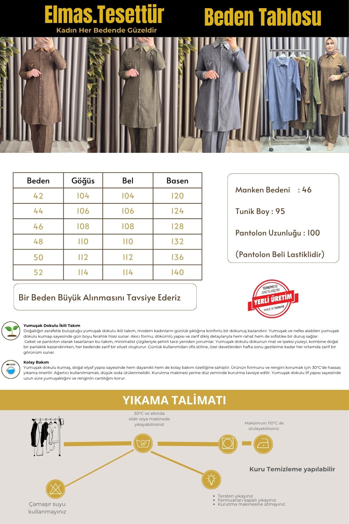 Doğallığın zarafetle buluştuğu yumuşak dokulu ikili takım, modern kadınların günlük şıklığına konforlu bir dokunuş kazandırır. Yumuşak, nefes alabilir ve hafif yumuşak dokulu kumaşı sayesinde gün boyu ferahlık hissi sunarken; akıcı formu ve zarif dikiş detaylarıyla hem rahat hem de sofistike bir duruş sağlar.