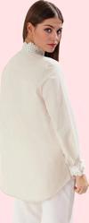 Yumuşak ve hafif yapısıyla gün boyu konfor sunan Terrycotton kumaşı, aynı zamanda dayanıklı ve kolay bakımlıdır. Dantel detaylar, gömleğe sofistike bir görünüm katarken, bej rengi, çeşitli kombinasyonlar için ideal bir zemin oluşturuyor. Uzun kolları sayesinde her mevsim kullanabileceğiniz bu gömlek, farklı vücut tiplerine uyum sağlayacak regular bir kalıba sahiptir. Hem rahatlığı hem de şıklığı arayan kadınlar için mükemmel bir seçimdir.