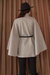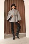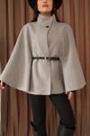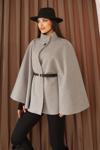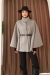 Kadın Gri Kemer Detaylı Pelerin Panço Kaban