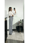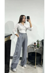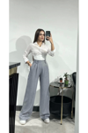 Kadın Gri Keten Düğmeli Yüksek Bel Palazzo Pantolon
