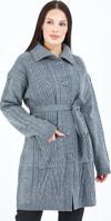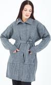 Kadın Gri Yakalı Düğmeli Cepli Kuşaklı Örme Triko Yün Uzun Hırka
