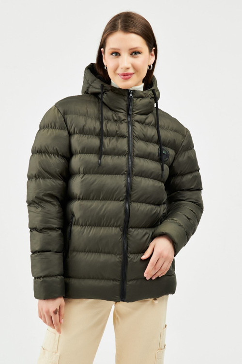 Kadın Haki Astarlı Su Ve Rüzgar Geçirmez Kapüşonlu Kışlık şişme Mont | L