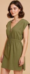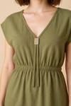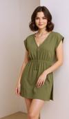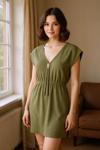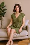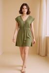 Lumiart Kadın Haki Yanları Yırtmaçlı Tokalı V Yaka Mini Plaj Elbisesi