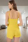Sizi yazın sıcak akşamlarında serin ve şık tutacak sarı renkli pijama takımımızla tanışın! Nefes alabilen örme kumaştan üretilen bu pijama takımı, ince askılı ve rahat kalıbıyla gün boyu konfor sunar. V yaka detayı ve zarif dantel işlemeleri, takımınıza feminen bir hava katarken, şık görünümünüzü tamamlamanıza yardımcı olur. Evde rahatlamak veya misafir ağırlamak için ideal olan bu 2'li takım, yaz aylarında vazgeçilmeziniz olacak. Yumuşak dokusu ve pratik kullanımıyla sizi büyüleyecek bu pijama takımını hemen sepetinize ekleyin!