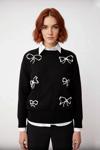 Ürün Özellikleri: Regular kalıp, akrilik polyester materyal, incili fiyonk desen, bisiklet yaka, standart kol, triko kumaş, siyah renk, nakışlı işlemeli tasarım.