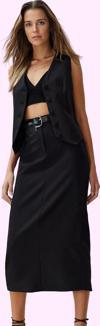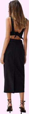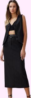 Zarif ve modern tasarımıyla dikkat çeken bu siyah kalem etek, gardırobunuzun vazgeçilmez parçalarından biri olacak. Midi boy uzunluğu ile hem şık hem de rahat bir görünüm sunar. Yüksek kaliteli dokuma kumaşı sayesinde vücudunuza mükemmel bir şekilde oturur ve gün boyu konfor sağlar. Düz deseni ve kalem kalıbıyla her ortama uygun, çok yönlü bir parçadır. Finike dokuma tekniği ile üretilen etek, kaliteli ve şık görünümünün yanı sıra dayanıklılığını da kanıtlar. Bel detayı ile kusursuz bir siluet oluşturur. Cepsiz tasarımıyla minimalist bir tarz sunar. Astarsız yapısı, yaz aylarında da rahatlıkla kullanılmasını sağlar. İş hayatında, günlük kombinlerde ya da özel günlerde şıklığınıza şıklık katacak bu eteği, topuklu ayakkabılar ve bluz ile kombinleyerek sofistike bir görünüm elde edebilirsiniz; ya da spor ayakkabılarla günlük şıklığı yakalayabilirsiniz.